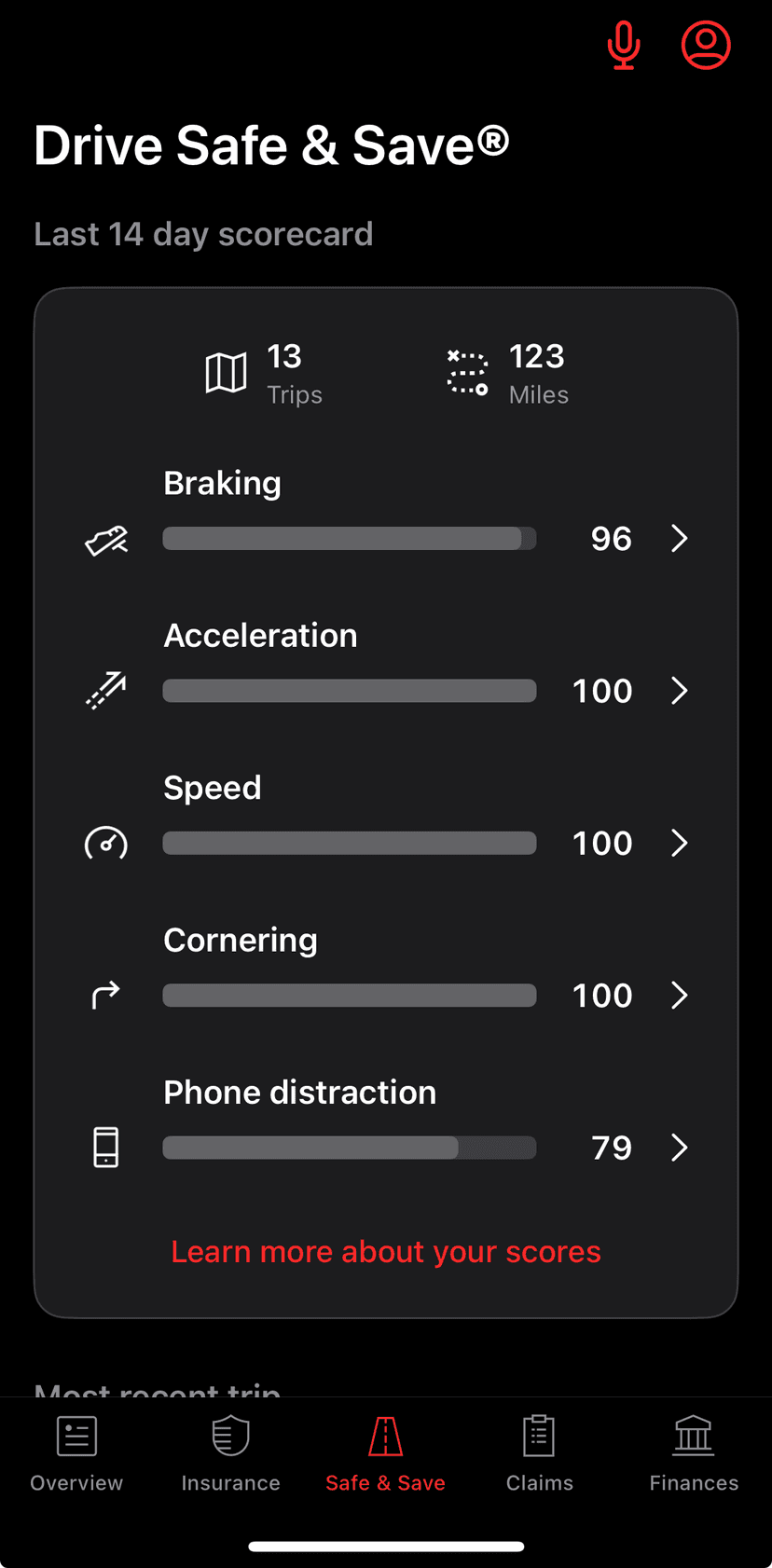 When you complete a trip, you’ll be able to view your score for each of these areas. State Farm notes that not every metric affects your discount, but it provides these insights to help you learn about your driving habits and improve them.