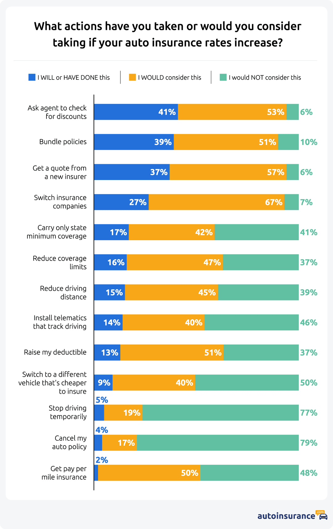 Downgrading coverage: Three-quarters of drivers would consider saving money by lowering coverage limits or raising deductibles. Either approach reduces premiums but leaves motorists liable for more significant out-of-pocket expenses. An increased deductible means paying more out-of-pocket before coverage kicks in, while lowering coverage limits can leave drivers on the hook for damages after an accident. Before reducing your insurance coverage, consider your capacity to handle unexpected costs on your own. One in five drivers say they’d consider canceling their auto policy if it became less affordable. However, canceling your policy is illegal in nearly every state, exposes you to unlimited financial risk, and will make it significantly harder and more expensive to secure insurance in the future. It pays off to have auto insurance, even a minimum liability-only policy.