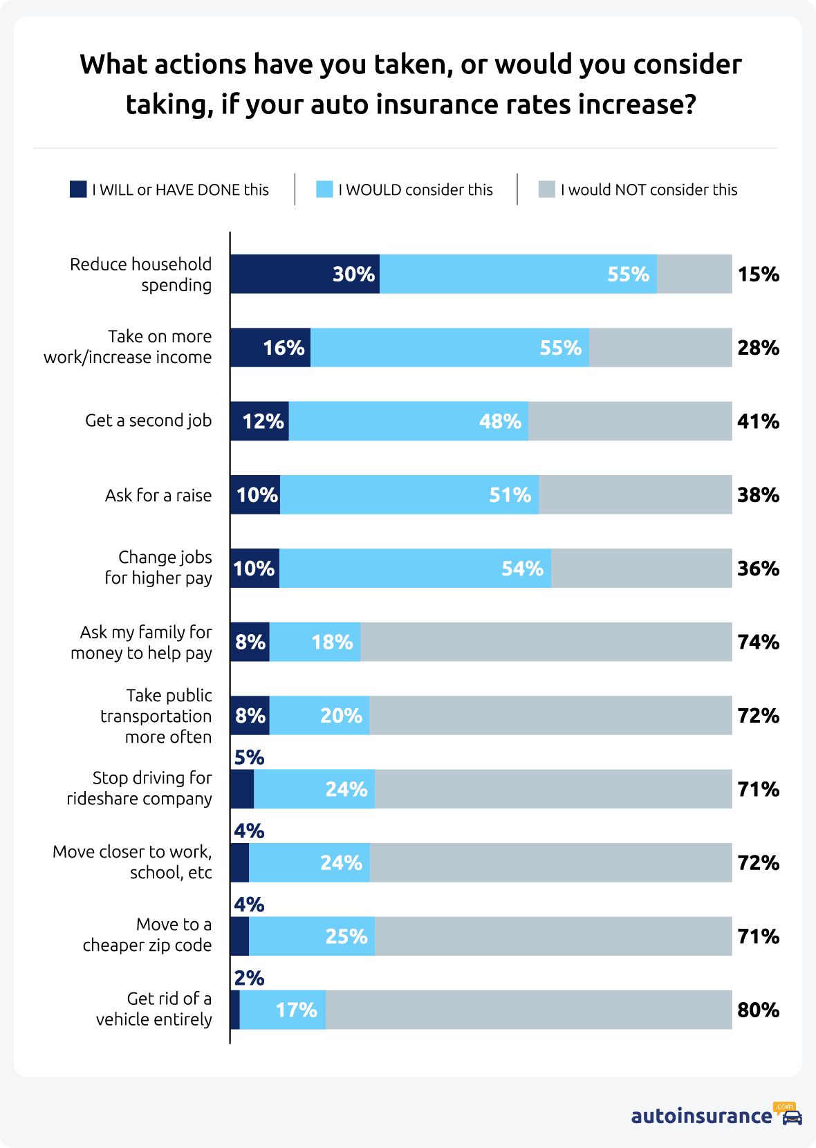 Reducing premiums is one way to make auto insurance more affordable. Alternatively, one might increase income or trim household budgets. Over one-third of Americans told us they had already altered their habits, earning potential, or spending patterns to tackle rising insurance costs.