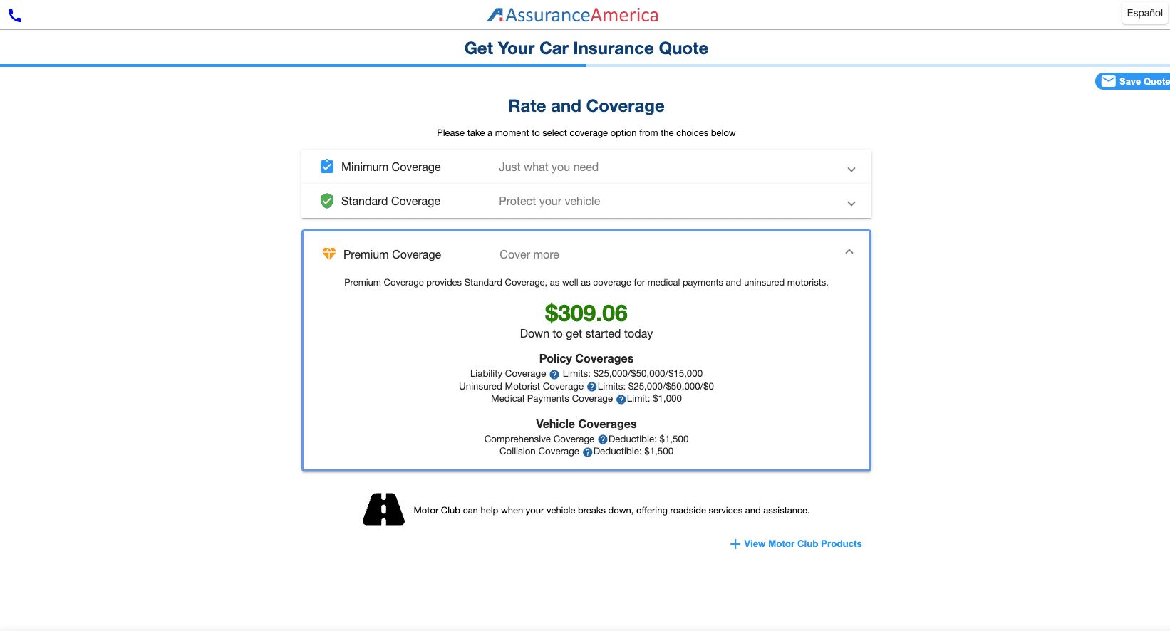 AssuranceAmerica doesn’t offer policies in my state (California), so I went through the online quote process using a clean driving profile for a woman in her 30s in Phoenix, Arizona. It was simple and easy; I just entered my personal information and got car insurance quotes for three levels of coverage: minimum, standard and premium.