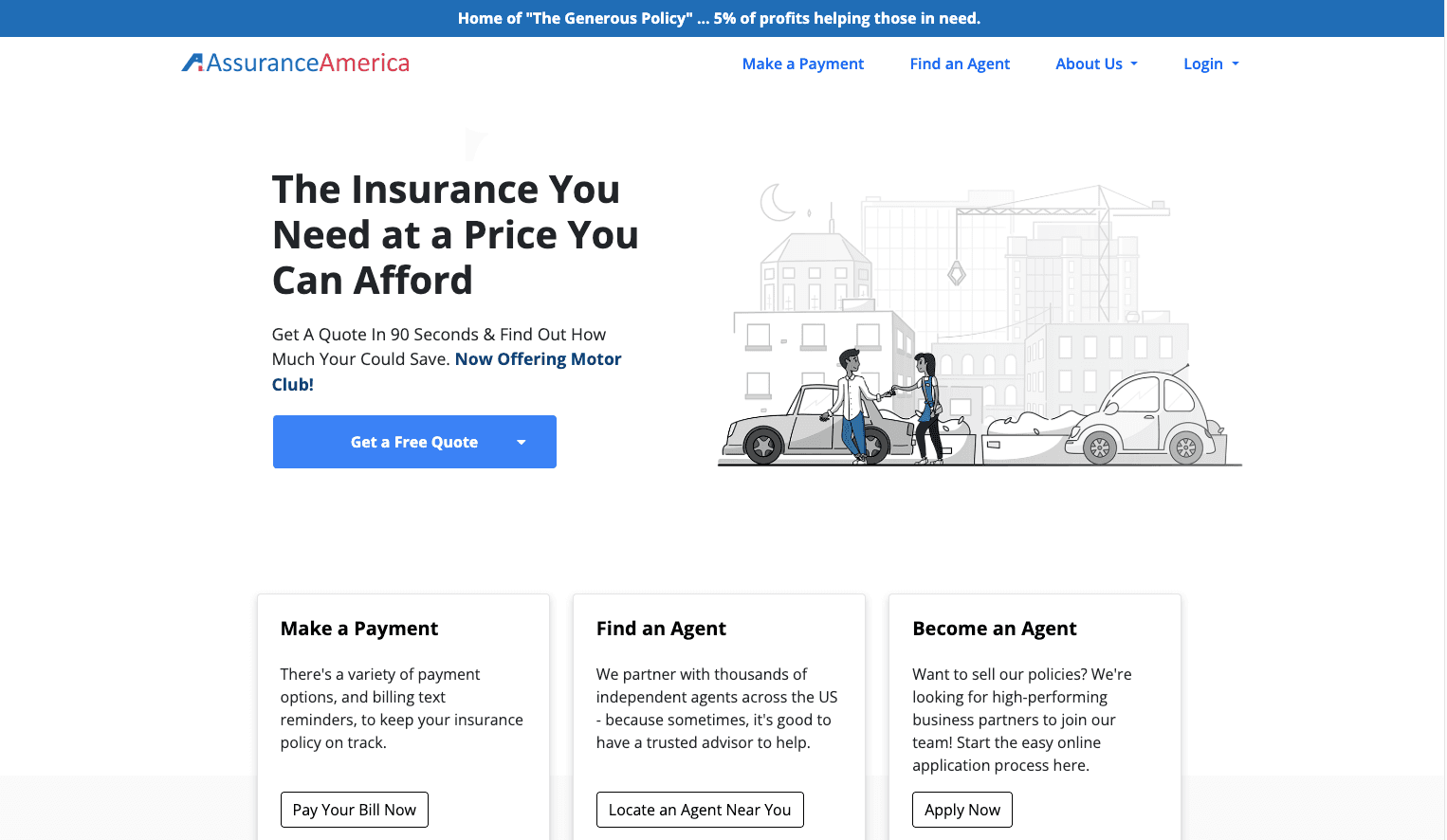 AssuranceAmerica has a simple, easy-to-use website that allows you to make payments, get a quote, and find an agent. Because I’m not a customer, I can’t speak to whether you can manage your policy on the website. I found the website user-friendly, but it didn’t offer any information about coverage or discounts.