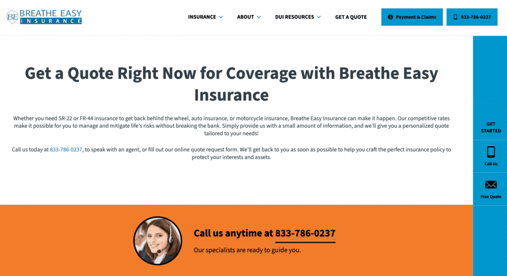 Breathe Easy’s website is straightforward and simple. The company’s phone number is displayed prominently on the page, which makes sense given that you must speak with an agent to get a quote. Alternatively, you can fill out a form with your contact information to have an agent call you.