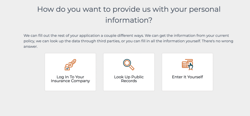 This time, I was prompted to add more of my current information and coverage preferences using one of three methods: linking the info via my current insurance company, looking up public records, or simply entering it myself.