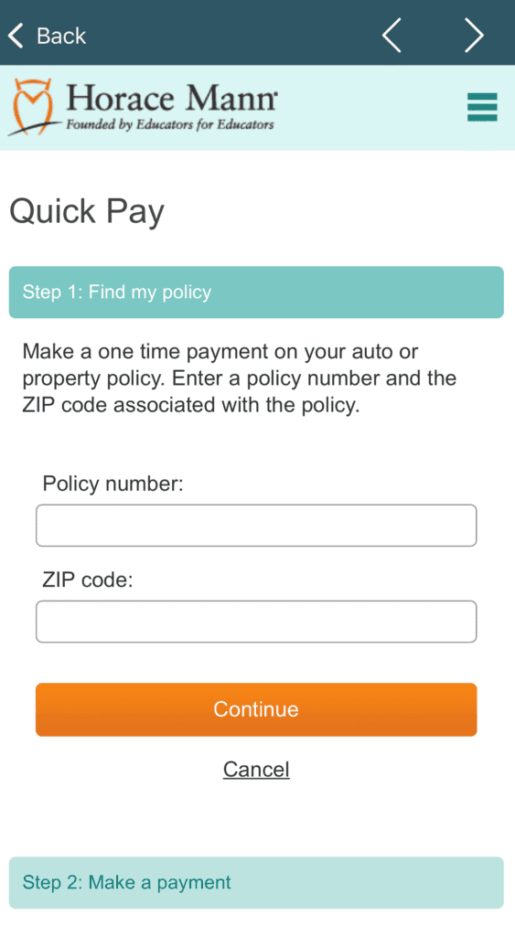 The claims feature is not native to the app and instead takes you to a web browser, which doesn’t provide the best user experience. It also provides a phone number if you prefer to call in your claim. The Pay option is similar to the Quick Pay link on the website, allowing you to make a payment without logging in — you’ll just need your name and policy number, as shown below.