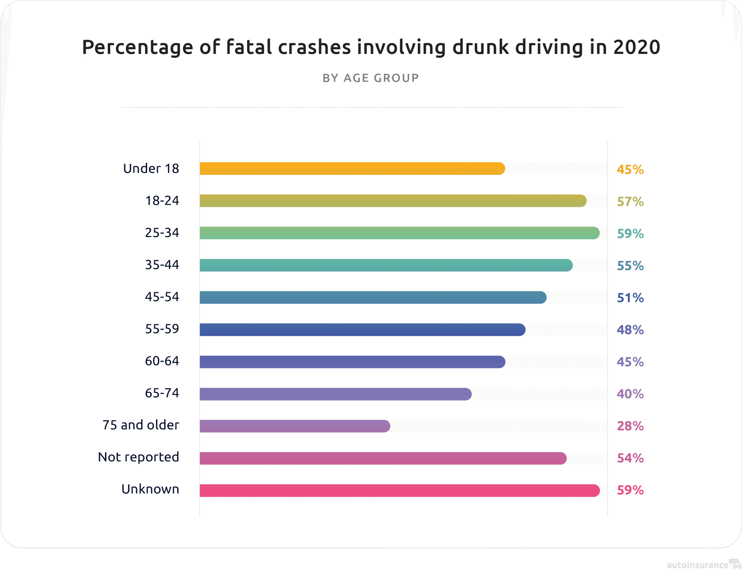 While teen drivers get a bad reputation for underage drinking and driving, in 2022 adults in their early 20s (aged 21-24) experienced the highest rate of death from drunk driving. A total of 43 percent of fatal crashes among this age group involved drunk driving. This marks a change from 2020 when adults aged 25-34 were the highest-risk demographic for drunk driving.4
