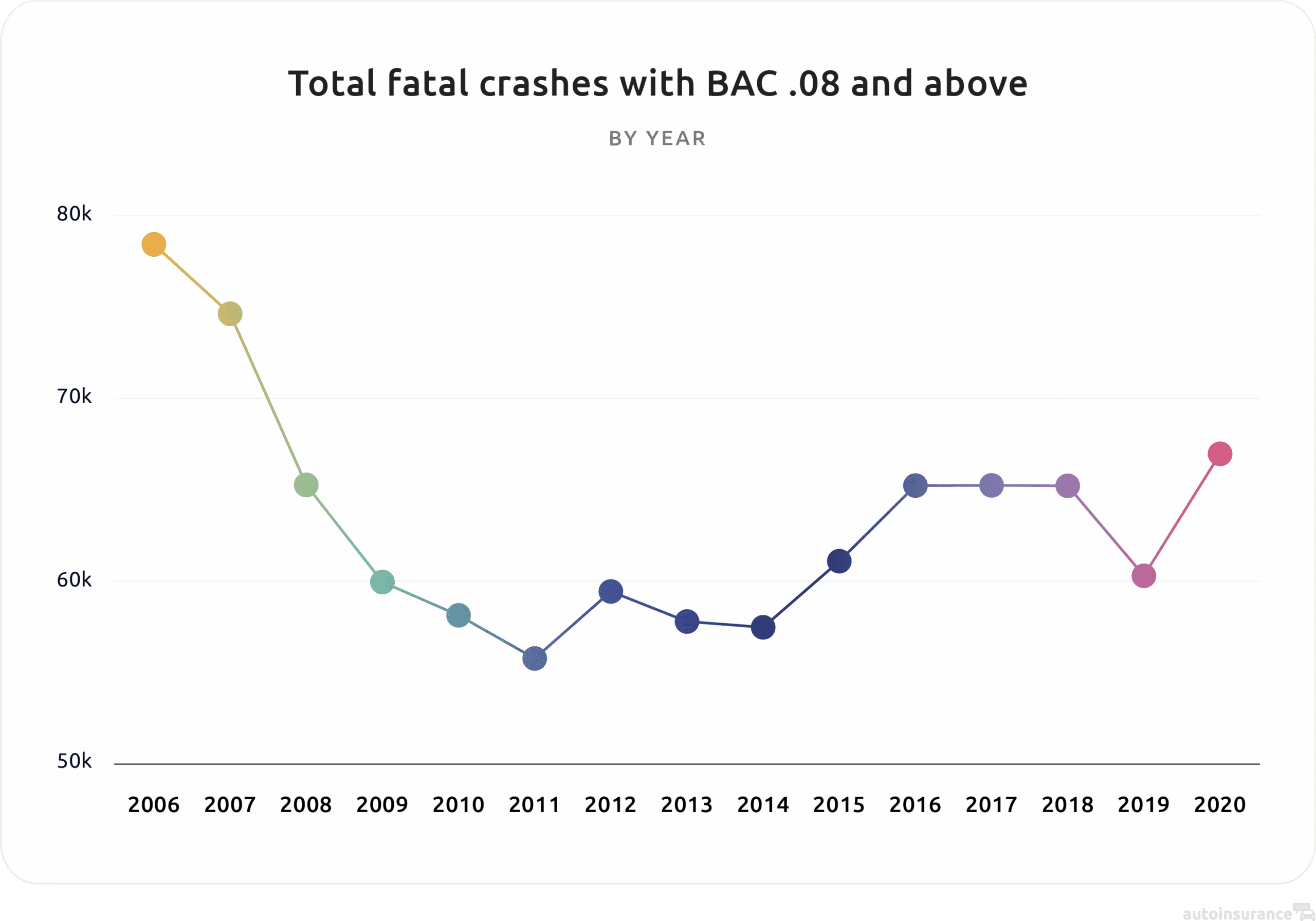 Note that the NHTSA records data based on the driver involved with the highest BAC, so if there are two drivers in the crash, one with a BAC of 0.00 (sober) and one with a BAC of 0.09 (drunk), the latter will be recorded and the crash will be considered alcohol-impaired.